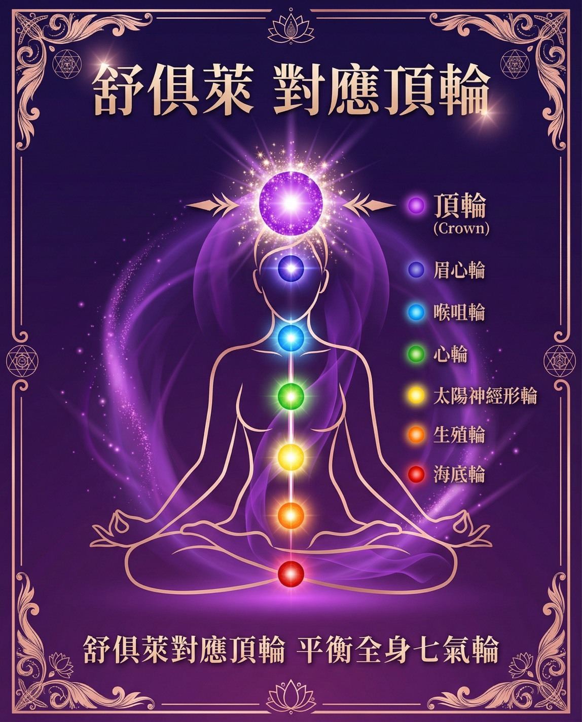 淨化與排毒: 舒俱萊對應頂輪,被認為具有淨化全身能量系統、協助排出負面情緒與能量「毒素」的作用。